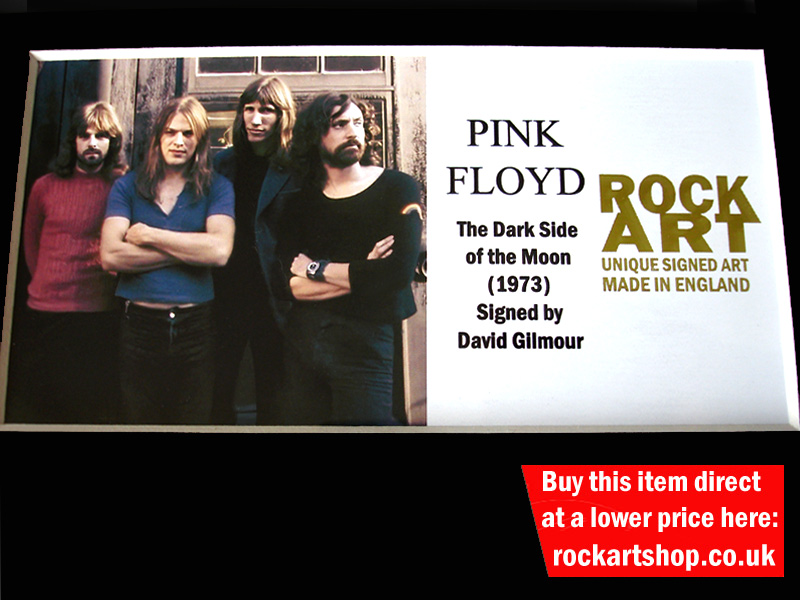 Unique framed Pink Floyd The Dark Side of the Moon display signed by David Gilmour, also features vintage 8×10″ Publicity Photo. The autograph is guaranteed 100% authentic and the piece comes supplied with a COA. The piece includes a plaque with artwork details, our Rock Art Unique Signed Art gold logo and a custom made black gallery mount in a bespoke frame, featuring a smooth matt black finish which coordinates perfectly with any decor.